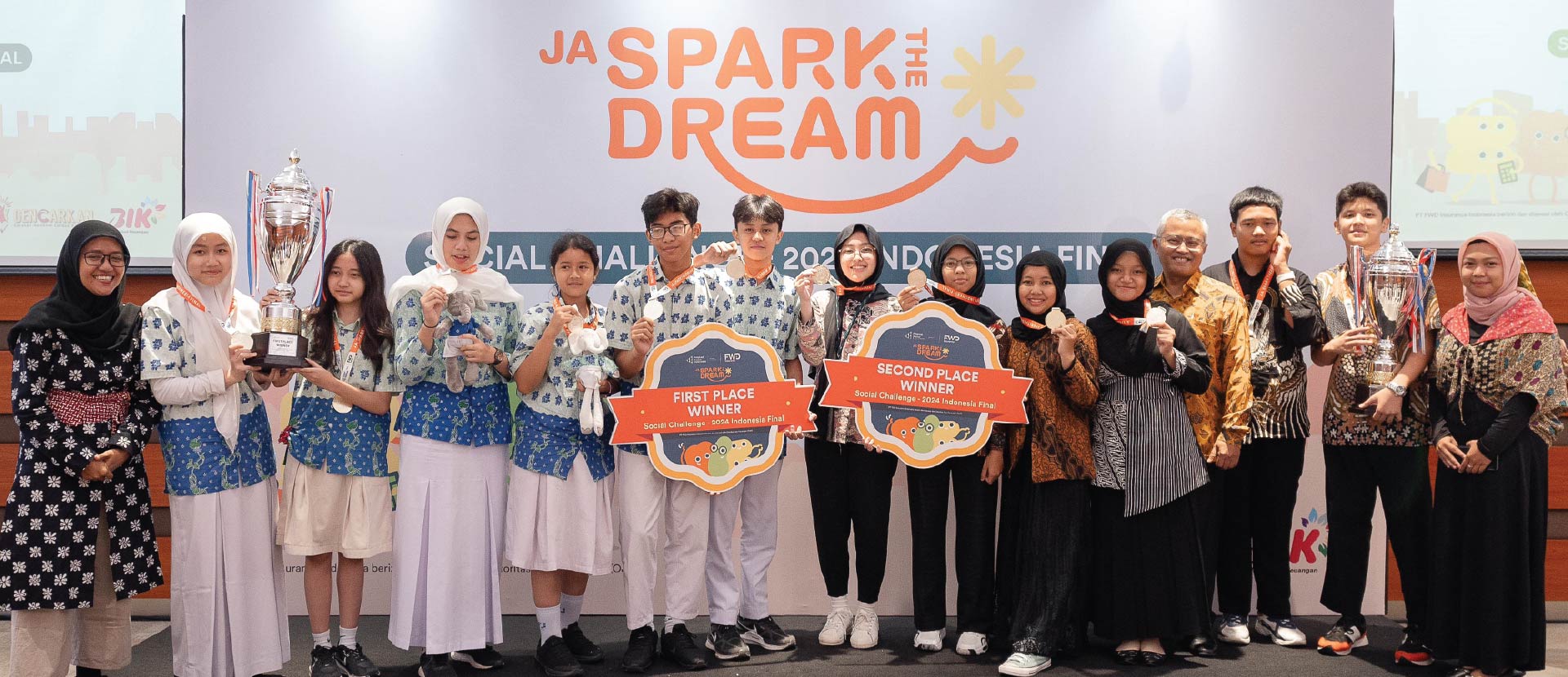 Nov 15, 2024 – PT FWD Insurance Indonesia and Prestasi Junior Indonesia proudly celebrate the achievement of students from SMPN 6 Depok and SMP Pembangunan Jaya Tangerang Selatan, who won first and second place in the JA SparktheDream Social Challenge – 2024 Asia Pacific Final, organized by FWD Group in collaboration with JA Asia Pacific on Thursday, November 14. This event facilitates students from six markets in Asia, including Hong Kong SAR, Indonesia, the Philippines, Singapore, Thailand, and Vietnam, to showcase their social innovation projects that contribute to the growth of financial literacy and inclusion among the youth.